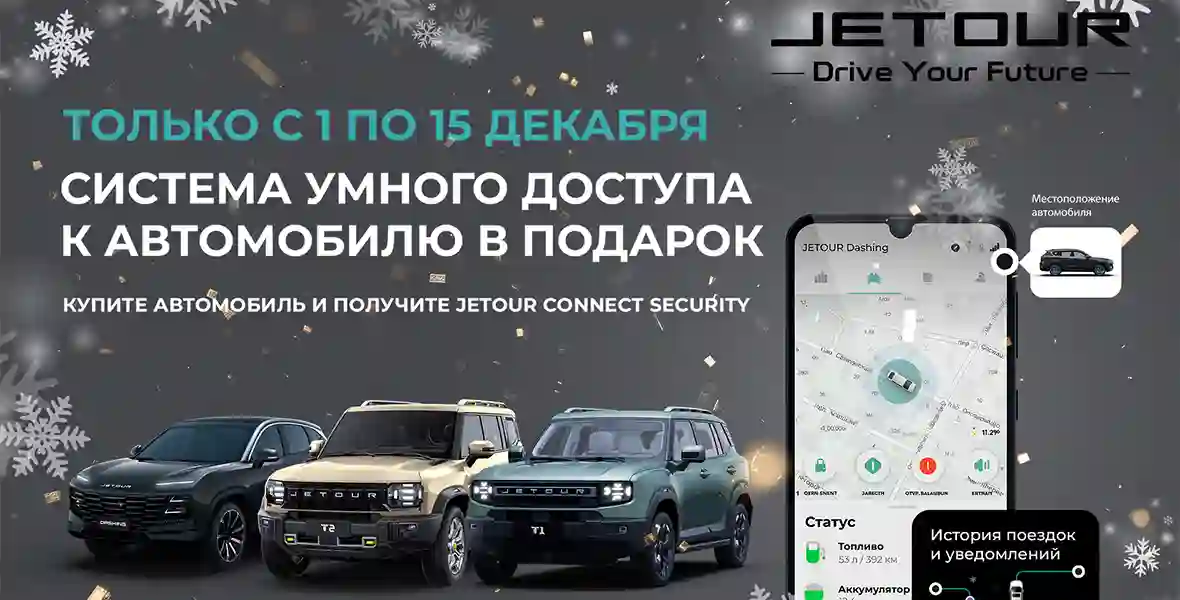 JETOUR объявляет о проведении специальной акции для всех новых клиентов автомобилей бренда. При покупке любой модели JETOUR с 1 по 15 декабря 2025 года каждый клиент, оформивший договор, полностью оплативший автомобиль и подписавший акт приема-передачи автомобиля в указанный период, получит телематическую систему JETOUR CONNECT SECURITY с установкой.